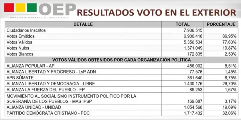 Según el cómputo oficial, Rodrigo Paz se ubicó en el primer lugar, con el 32,06% de los votos, seguido de Jorge Tuto Quiroga con el 26,70%.