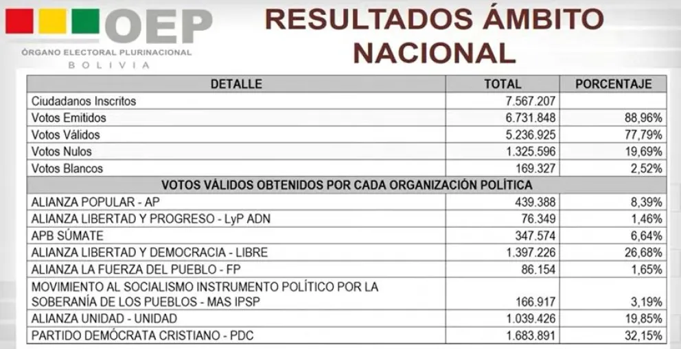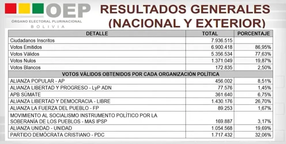 Según el cómputo oficial, Paz se ubicó en el primer lugar con el 32,06% de los votos, seguido de Quiroga con el 26,70%. La ley establece la segunda vuelta al no superar ningún candidato el 50% más uno de los votos, o el 40% con una diferencia de 10 puntos.